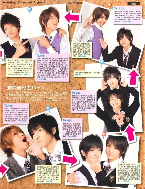 "Well then, can I date you? Although I have already got 8 girlfriends, you can be the 9th, is that okay for you? So then, I can overlord among everyone in JUMP!!! Ah, perhaps you've already realized, the so-called "girlfriends", are indicating the rest of the HSJ members~ (laugh)